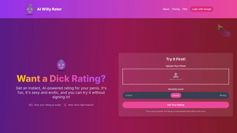 AI Willy Rater 是一个创新的网站,通过上传的图像提供基于人工智能的男性生殖器评分。它创造了一个愉快、私密和个性化的体验,提供深入反馈、聊天功能、音频描述和竞争性的“阴茎战斗”竞技场等选项。该平台优先考虑用户隐私,确保图像在评估后安全处理并及时删除。此外,它还提供开发者API,允许将人工智能阴茎评分集成到其他各种平台中。