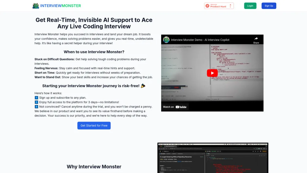 Interview Monster 是一个由人工智能驱动的编码面试助手,在实时编码面试中提供实时提示和支持。它通过多种观看选项(如 HDMI 连接器和移动设备访问)提供隐秘的帮助,使用户能够应对具有挑战性的问题,保持自信,并有效展示他们的技能。