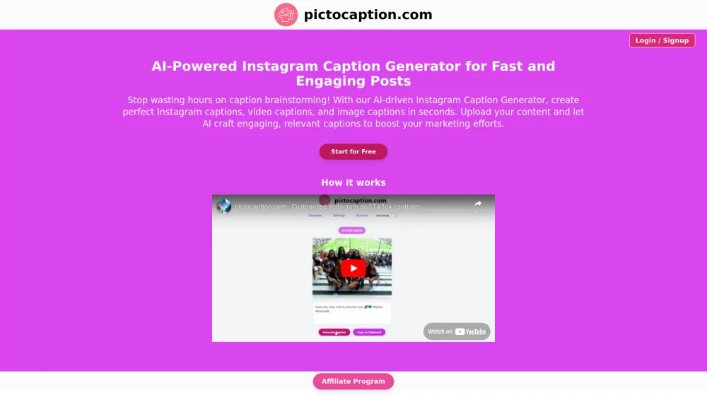 Pictocaption.com 是一个由人工智能驱动的平台,能够快速为图像和视频创建适合社交媒体网站(如 Instagram 和 TikTok)的字幕。用户可以个性化字幕,以反映他们品牌的声音,并可以使用众多自定义功能。该工具旨在帮助用户克服写作障碍,仅需几秒钟即可提供理想的、现成的字幕。
