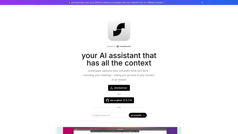 Screenpipe 是一个开源库,持续录制您的屏幕和麦克风,提供与大型语言模型(LLMs)的无缝连接。它的主要目的是收集生活上下文,并便于与 AI 的轻松集成,以用于各种应用,包括搜索和自动化。该库能够在毫秒级别内安全捕获、搜索和分析您组织中的屏幕和音频活动。