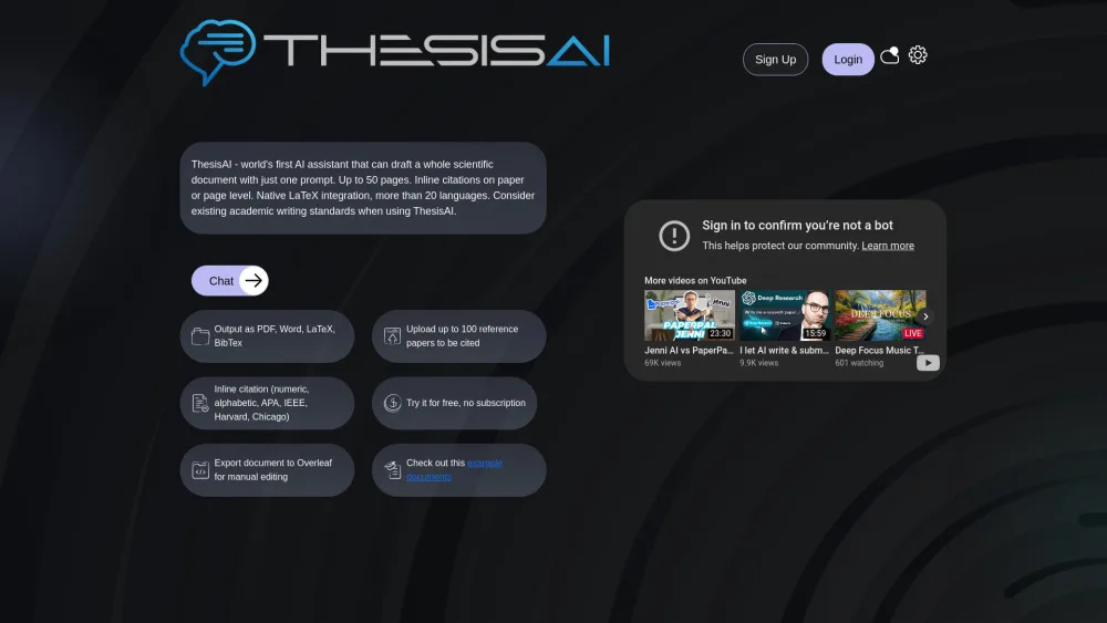 ThesisAI is an AI-powered assistant that facilitates the drafting of scientific documents, capable of producing up to 50 pages from just one prompt. It features seamless LaTeX integration, supports more than 20 languages, and includes inline citation capabilities. Users have the option to upload or import as many as 100 papers for citation purposes and can export their documents to Overleaf for further manual editing.