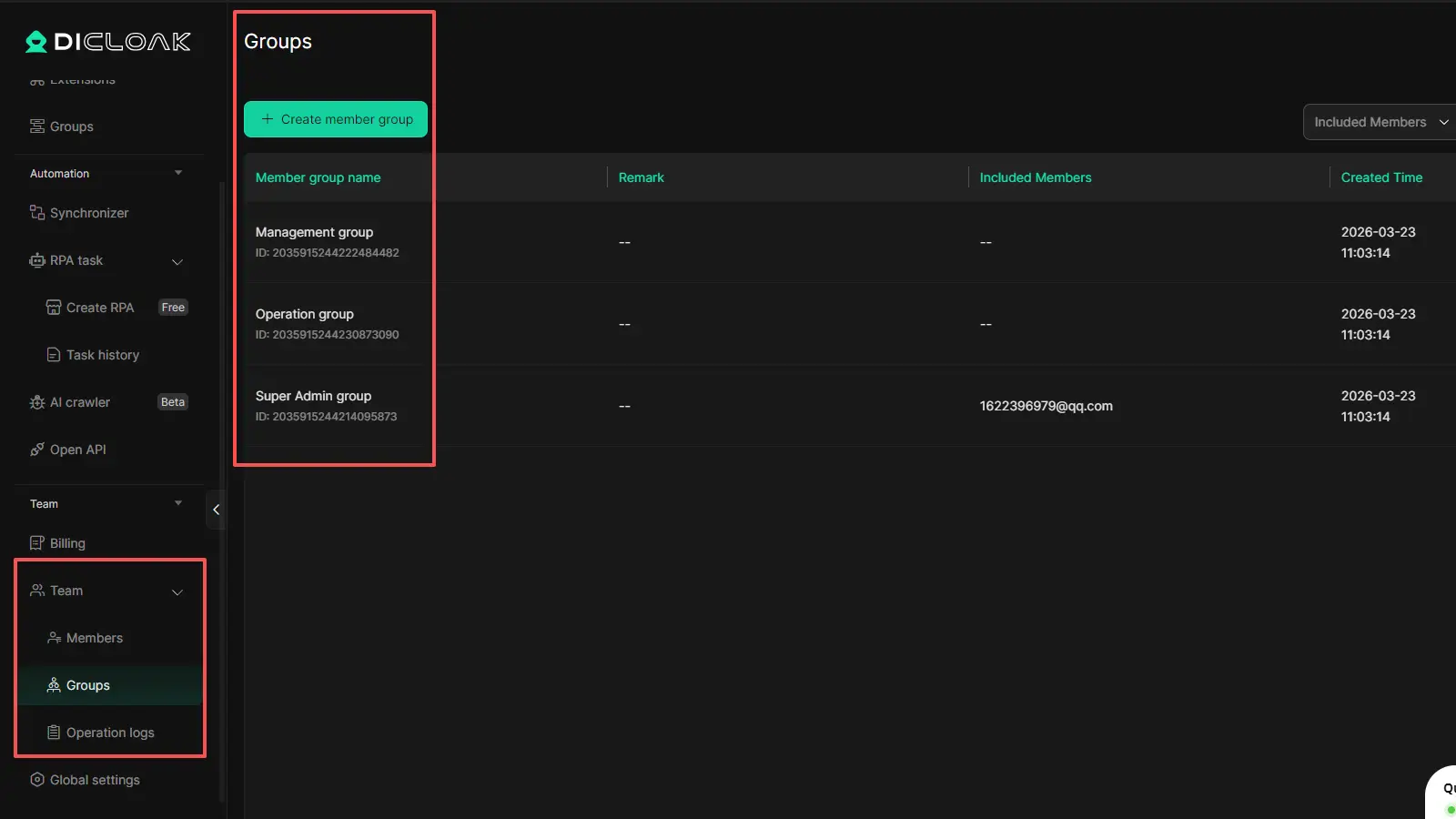 DICloak同样支持团队协作模式。文档中提到了环境共享、成员权限及操作日志功能,可帮助团队更有序地管理共享访问权限。网站访问限制、安全防护模式等功能进一步增强了协作式账号管理的可控性。