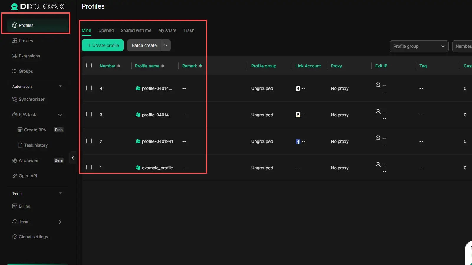 针对多账号工作场景,DICloak是更具针对性的选择。不同于通用型基于Chromium内核的浏览器,它围绕隔离浏览器环境、独立指纹以及代理管理构建,能更干净地管理大量账号。DICloak还支持批量环境操作、自动化功能以及团队访问控制,因此更适合规模化管理社交媒体、电商或客户账号的用户。