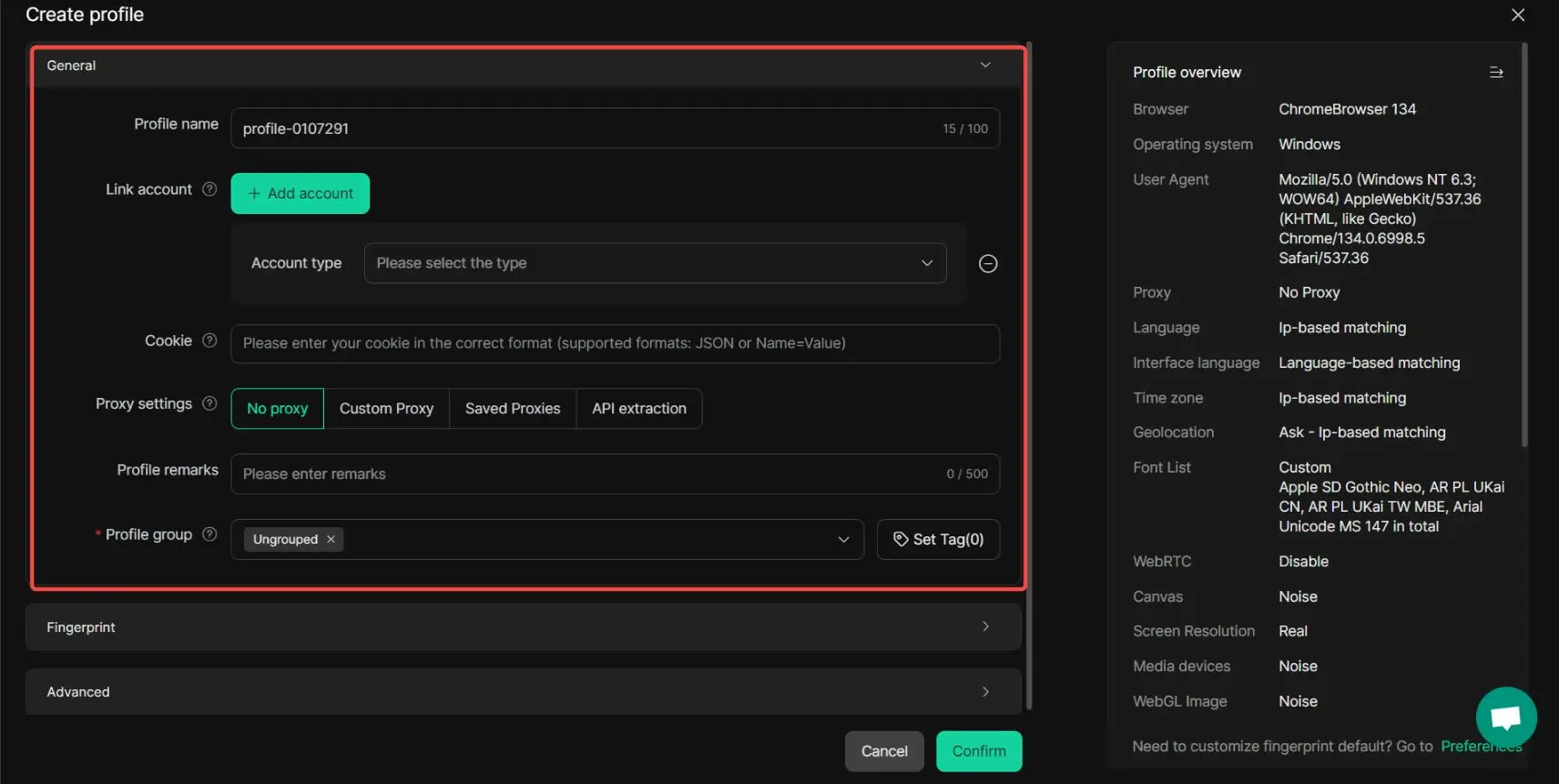 在常规设置中,先填写环境的核心信息。DICloak要求输入唯一的环境名称,你还可以添加关联账户、JSON格式的Cookie、代理设置、环境备注和环境分组。可选的代理方式包括无代理、自定义代理、已保存代理和API提取。