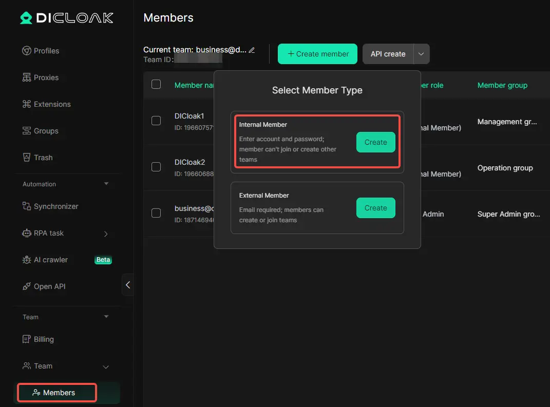 使用团队功能创建成员账户,并邀请队友加入您的DICloak团队。