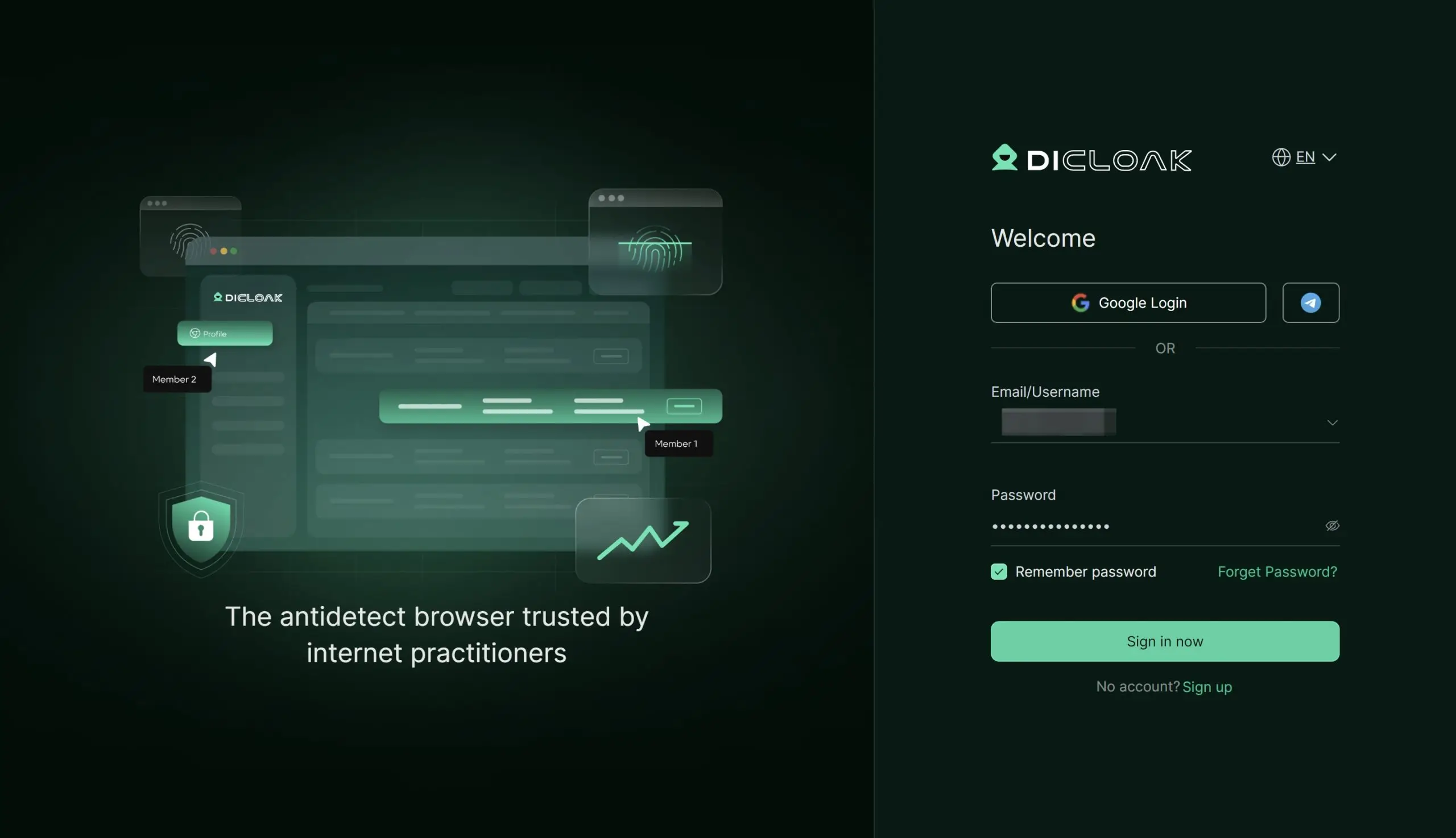 解决共享问题的现代且安全的方案是使用指纹浏览器。这项技术旨在安全地管理多个在线身份,使其成为受控账户共享的理想工具。推荐的工具DICloak解决了上述风险方法中固有的问题。