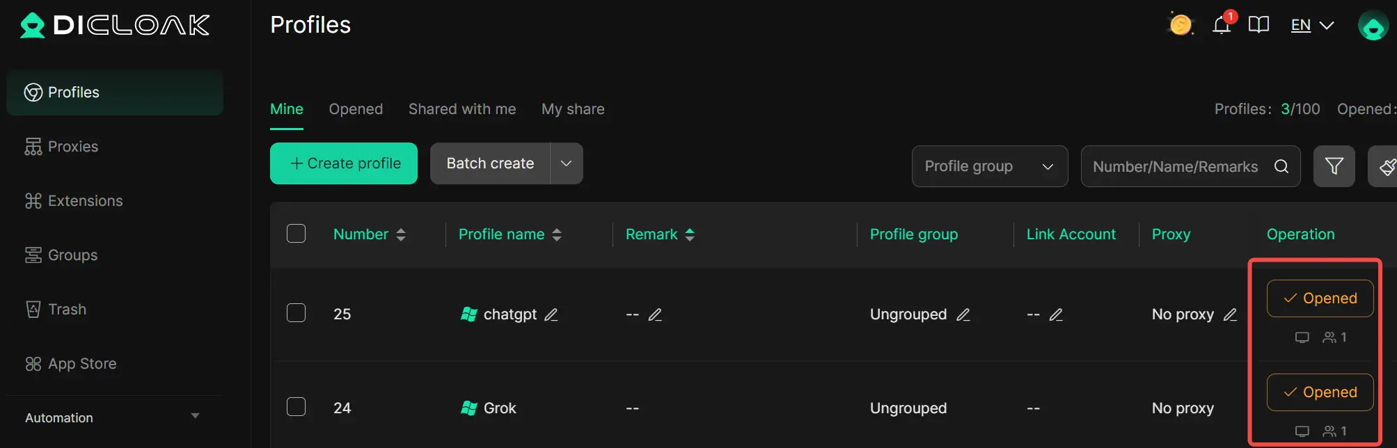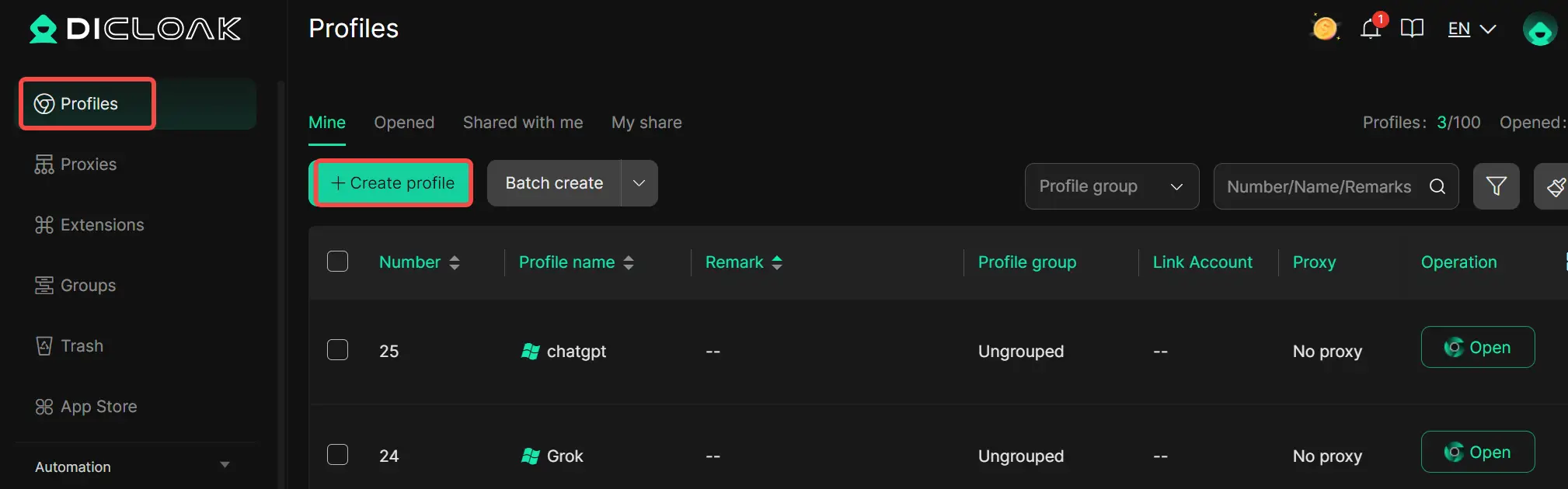 在DICloak应用程序内,创建一个新的环境,作为共享Grok或ChatGPT账户的专用环境。