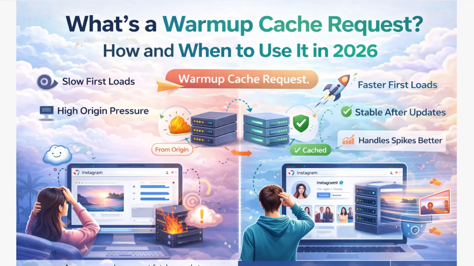 缓存预热请求是一种在真实访客到来前提升页面加载速度的简单方法。无需等待首位用户触发缓存创建,系统会提前发送请求,让页面提前被存储并做好响应准备。这一点至关重要,因为预热后的缓存能够减少首次加载延迟、降低源站压力,还能帮助重要页面在更新、缓存清除或流量峰值后保持更稳定的状态。在本指南中,你将了解什么是缓存预热请求、它的工作原理、适用场景,以及若想在2026年提升网站速度需要避免哪些错误。