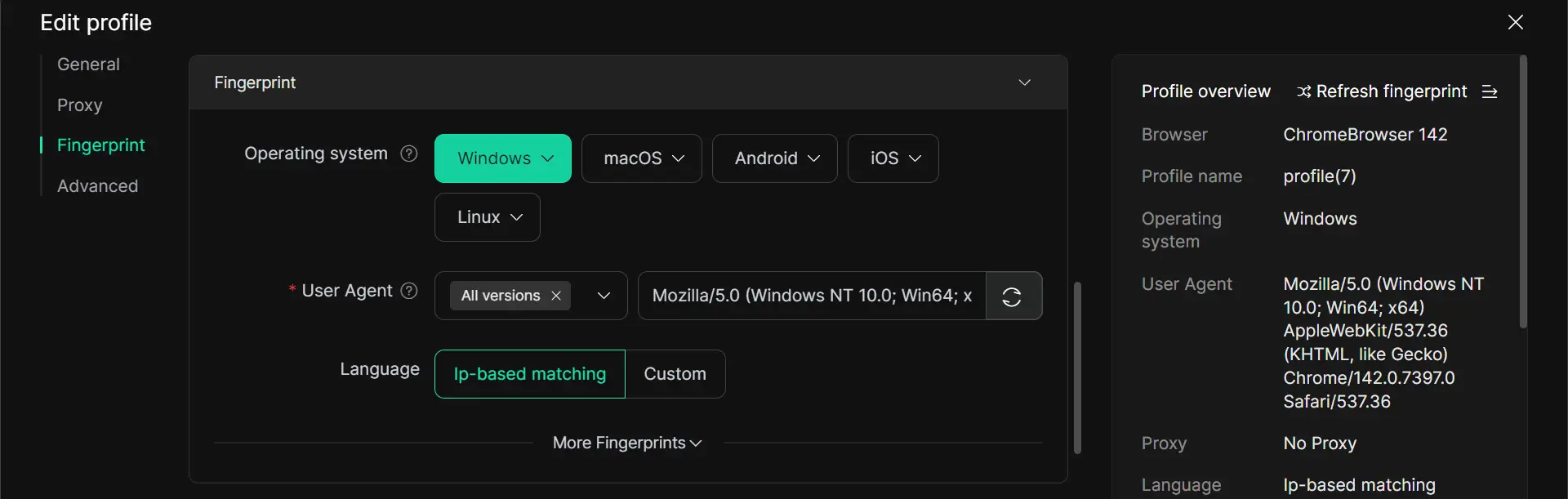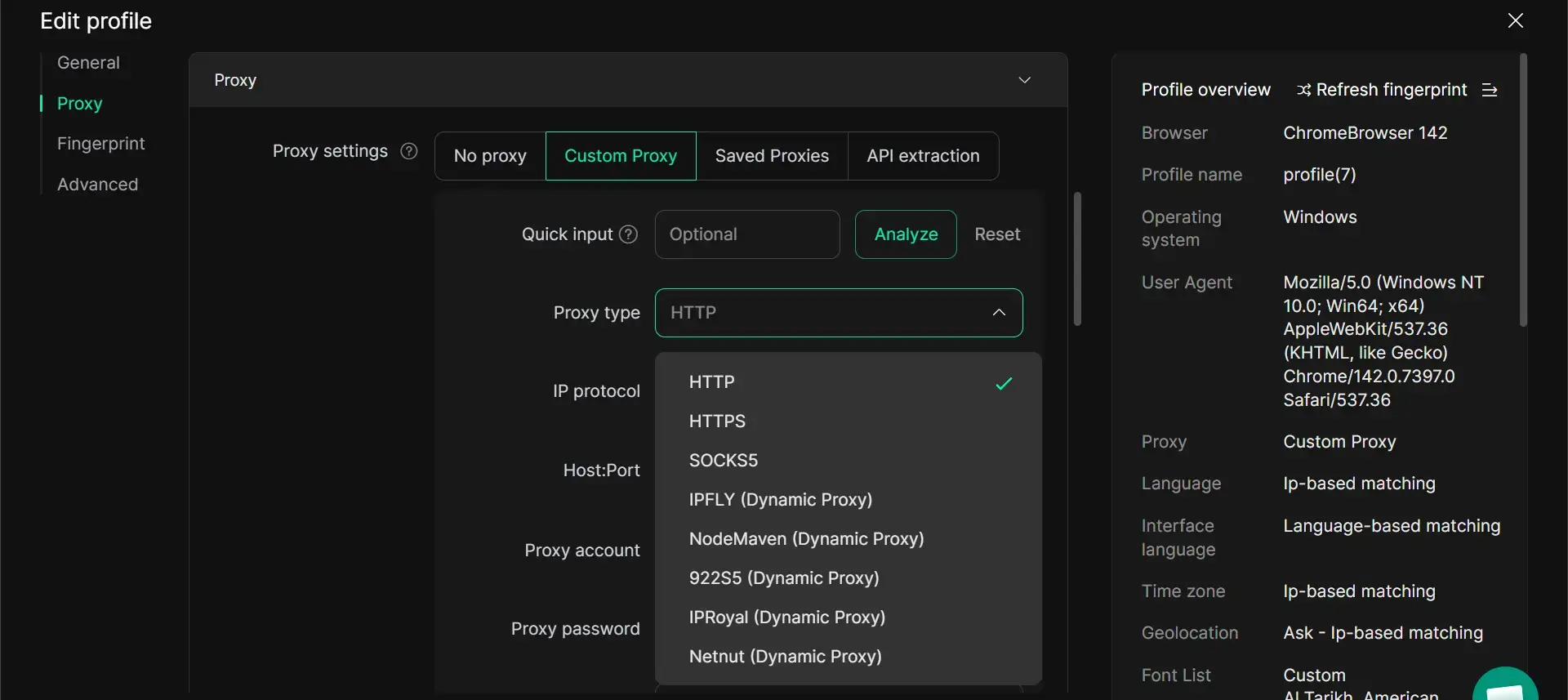 另一项核心功能是灵活的代理配置。每个浏览器环境都支持用户配置专属代理,有助于保持登录地点的一致性。这能减少诸如登录地点突然变更这类可疑信号,而这类信号可能会触发Snapchat等平台的安全校验或带来账号风险。